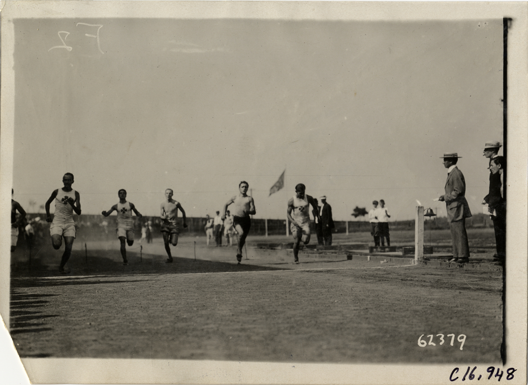 View of runners crossing finish line during the 1910 Flatbush Marathon race. Stamped on back: "Spooner & Wells, Inc., photographers, telephones 3472-3473 Columbus, 1931 Broadway, New York." Handwritten on back: "The Flatbush Marathon. Sporting events--Track and field, 1910."