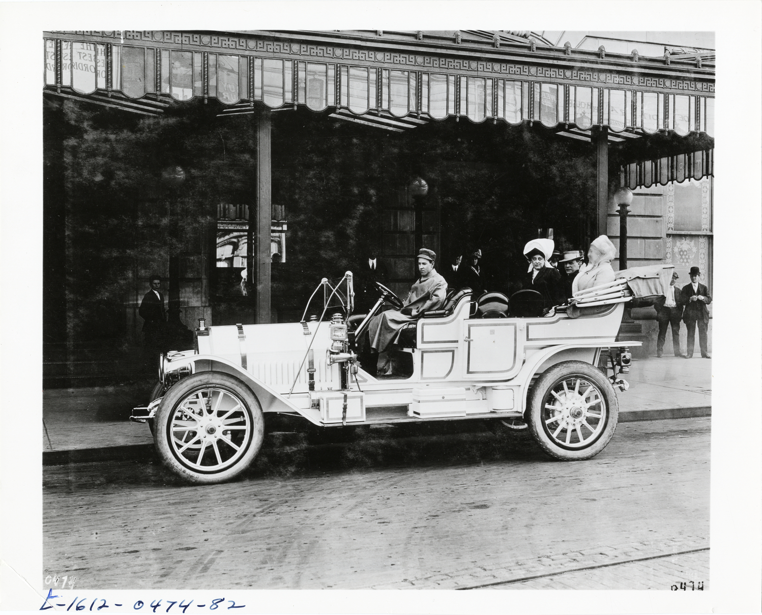 View of driver and passengers posing in Thomas car. Handwritten on back: "Sold for $10,000, owned by L.A. Neuman, taken in Detroit in summer of 1910. Thomas."