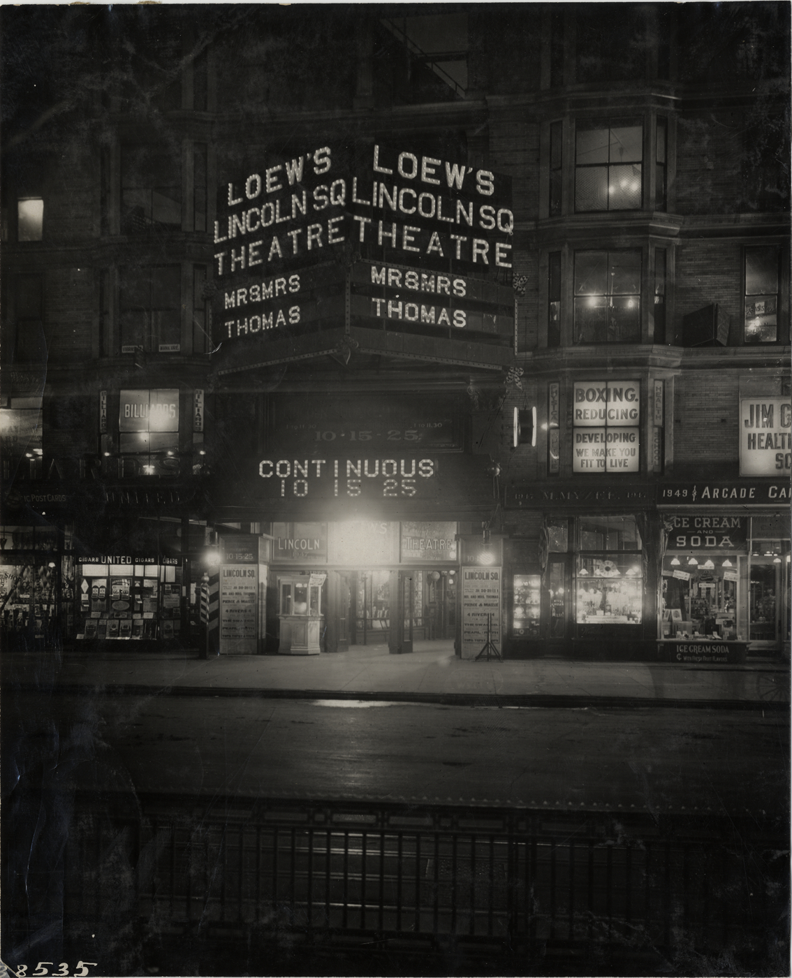 Nighttime view of Loew's Lincoln Square Theatre in New York. "Mr. & Mrs. Thomas, continuous, 10, 15, 25" in electric lights on marquee. Lighted storefronts on street. Stamped on back: "Spooner & Wells, Inc., photographers, telephones 3472-3473 Columbus, 1931 Broadway, New York." Handwritten on back: "Loew's Lincoln Square Theatre, New York City, 1911. Theaters."