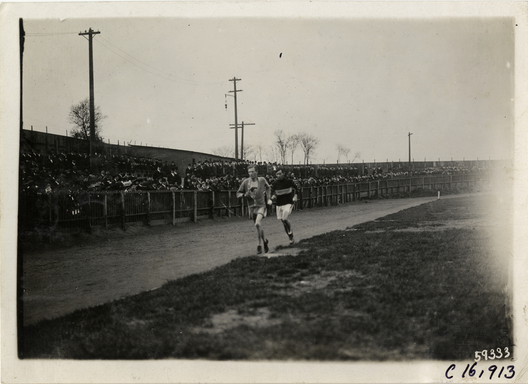 View of James Crowley and unidentified runner competing in marathon race. Spectators in background. Stamped on back: "Spooner & Wells, Inc., photographers, telephones 3472-3473 Columbus, 1931 Broadway, New York." Handwritten on back: "Sporting events--Track and field, 1910."