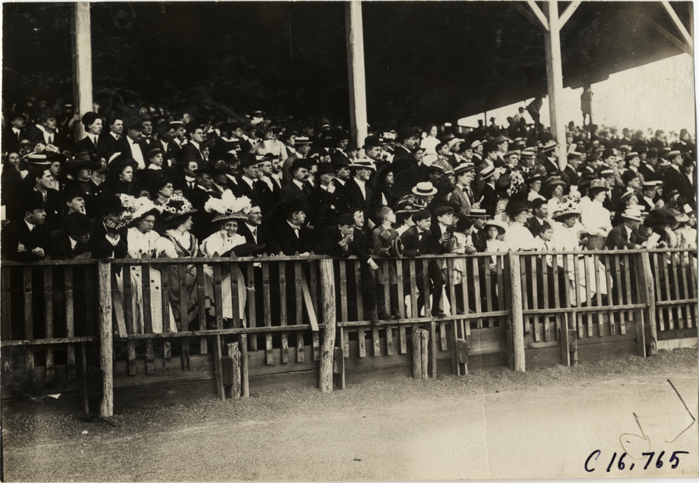 View of spectators in grandstand at track meet. Handwritten on back: "Sporting events--Track and field, 1909."