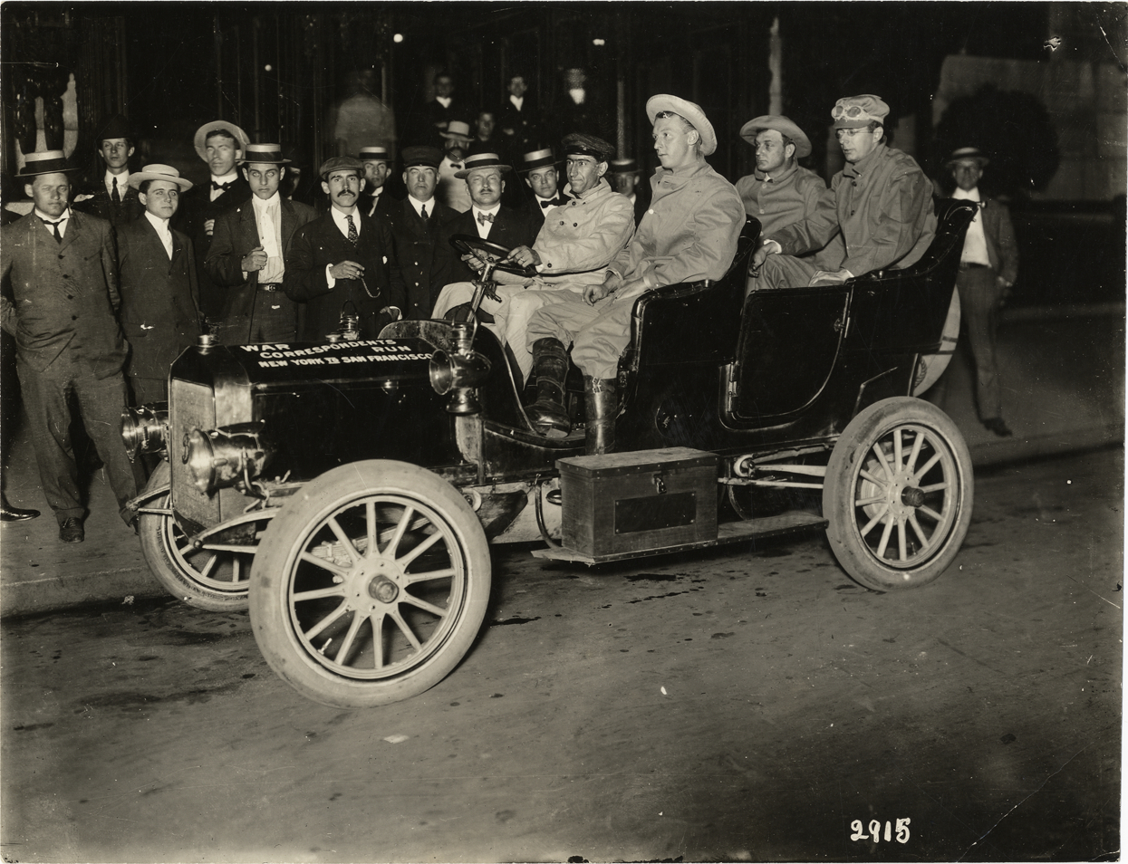 View of motorists in Studebaker car during the War Correspondents Run from New York to San Francisco. "War Correspondents Run, New York to San Francisco" painted on hood of car. Group of onlookers stand on sidewalk in background. Stamped on back: "N. Lazarnick, commercial photographers, makers of industrial motion pictures, 246 W. 42d St., N.Y., Tel. Chickering 1717-18. 5005 Euclid Ave., Cleve., Randolph 7852." Handwritten on back: "Studebaker, c.1908."