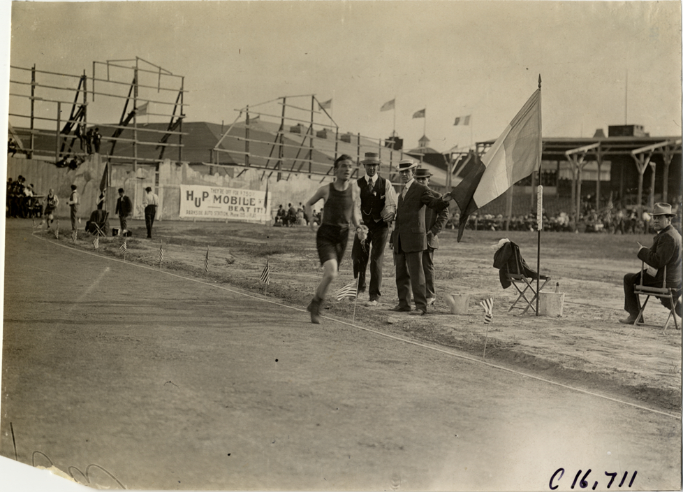 View of runner competing in race at track meet. Officials watch from sidelines; banner advertising the Hupmobile in background. Handwritten on back: "Sporting events--Track and field, 1909."