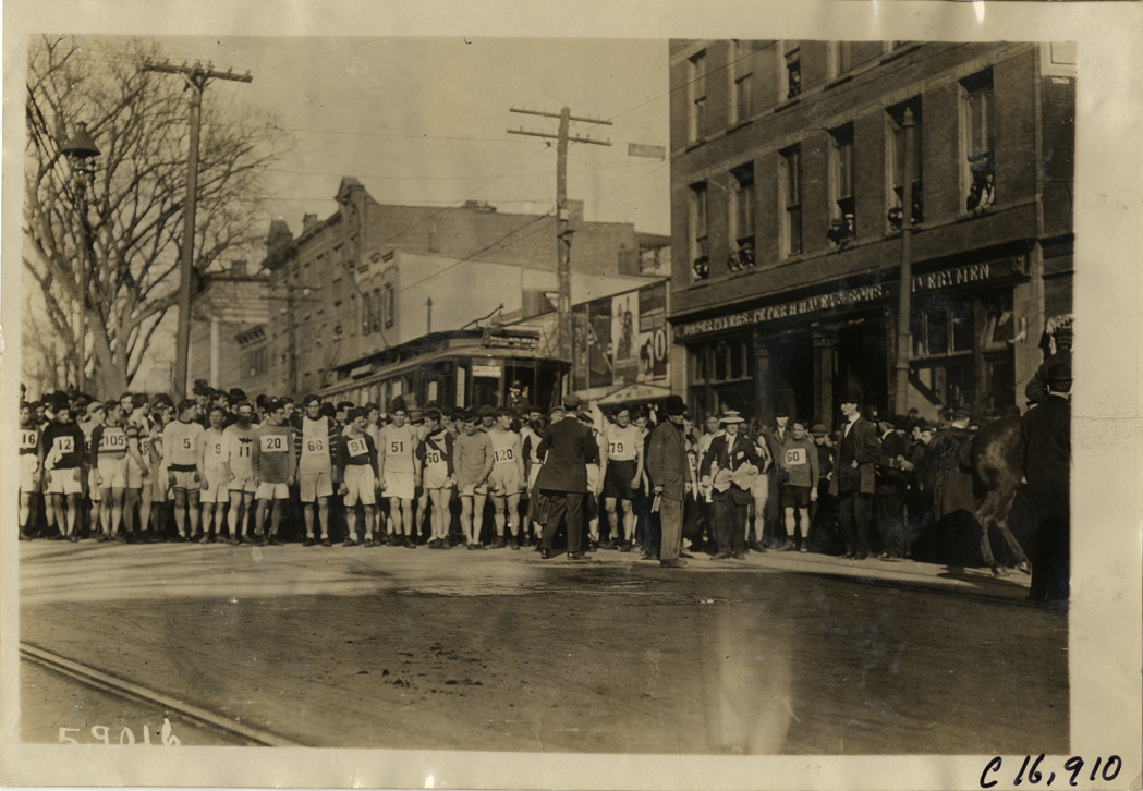 View of runners lined up in street for start of marathon race. Commercial buildings in background. Stamped on back: "Spooner & Wells, Inc., photographers, telephones 3472-3473 Columbus, 1931 Broadway, New York." Handwritten on back: "Sporting events--Track and field, 1910."
