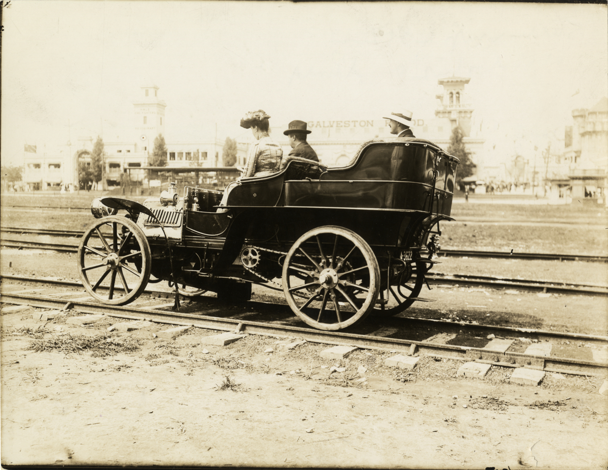 View of woman and two men in Napier car, traveling on railroad tracks in St. Louis, Missouri. Stamped on back: "Photo by N. Lazarnick." Handwritten on back: "[undecipherable] in St. Louis, at end of this a dinner."