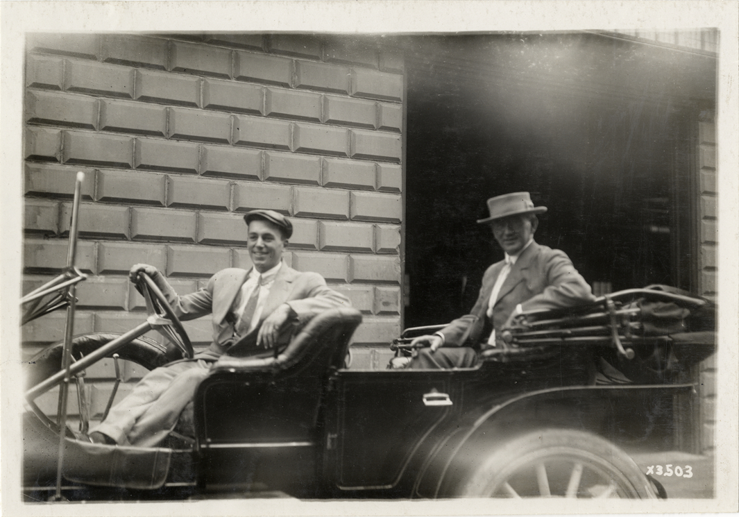 J.B. Sheppard and unidentified man in automobile, 1911 Chalmers factory tour for Carl H. Page & Company representatives