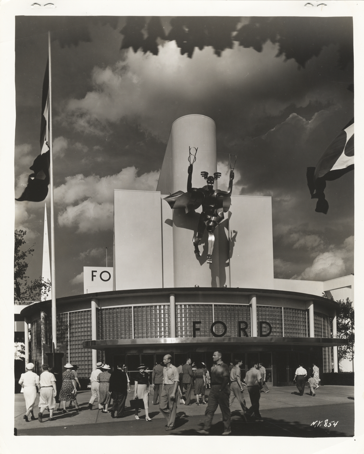 View of sculpture of Mercury by Robert Foster on the facade of the Ford Exposition building at the New York World's Fair. Pedestrians in foreground. Typed on back: "Mercury guards Ford Exposition at Fair. Made of shining stainless steel sheets, this god of the machine age dominates the front entrance to the Ford Exposition, the most beautiful building at the New York World's Fair, and looks down calmly on the more than 25,000 persons an hour who enter at peak times. Mercuy, the work of the famous sculpture, Robert Foster, and the world's largest sculpture of the winged messenger, is attracting wide attention among art critics. Foster calls this new type of work 'structural sculpture.' Mercury is 25 feet high, weighs three tons, and has no supporting pillar, but provides his own support because his weight is carried back from the shoulders to the draperies and thence to the building. In one hand Mercury holds a V-8 emblem, symbolizing the Ford, and in the other a V-12 emblem, symbolizing the Lincoln-Zephyr."