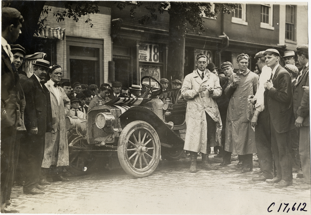 View of motorists and onlookers posing with Mitchell car during the 1909 Catskill-Berkshire Tour sponsored by the New York Automobile Trade Association. Storefronts in background. The tour covered a route through New York, New Jersey, Massachusetts and Connecticut. Stamped on back: "Spooner & Wells, Inc., photographers, telephones 3472-3473 Columbus, 1931 Broadway, New York." Handwritten on back: "[undecipherable] Pittsburg, Mitchell. Tours--Catskill-Berkshire Tour, 1909."