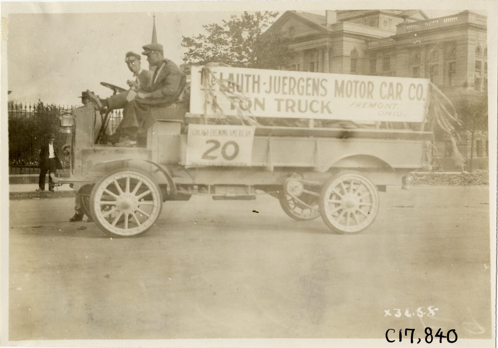View of driver and passenger in McLauth-Juergens truck no. 20 during the 1911 reliability contest sponsored by the Chicago Motor Club. Contestants traveled on routes through Illinois, Indiana, Kentucky, Ohio and Michigan. Sign on truck reads: "McLauth-Juergens Motor Car Co. 1 ton truck, Fremont, Ohio." Stamped on back: "Spooner & Wells, Inc., photographers, 1231 Woodward Ave., Detroit, Mich., telephone North 1745." Handwritten on back: "Tours--Chicago Reliability Run, 1911."