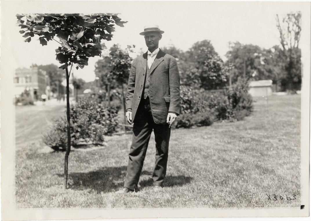 View of I.S. Craft, from Tampa, Florida, posing on lawn during the 1911 Chalmers factory tour for representatives of the Carl H. Page & Company held in Detroit, Michigan. Stamped on back: "Spooner & Wells, Inc., photographers, 1231 Woodward Ave., Detroit, Mich., telephone North 1745." Handwritten on back: "I.S. Craft, Tampa, Fl. Tours--Chalmers salesmen factory tour, 1911."