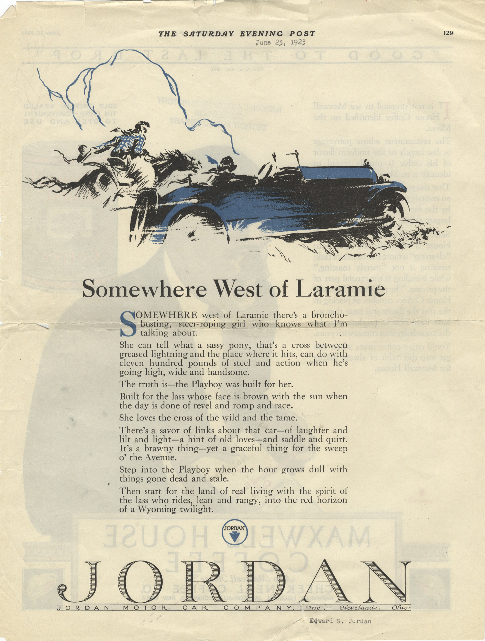 Advertisement for Jordan cars from the Saturday Evening Post. Text reads: "Somewhere west of Laramie. Somewhere west of Laramie there's a broncho-busting, steer-roping girl who knows what I'm talking about. She can tell what a sassy pony, that's a cross between greased lightning and the place where it hits, can do with eleven hundred pounds of steel and action when he's going high, wide and handsome. The truth is -- the Playboy was built for her. Built for the lass whose face is brown with the sun when the day is one of revel and romp and race. She loves the cross of the wild and the tame. There's a savor of links about that car -- of laughter and lilt and light -- a hint of old loves -- and saddle and quirt. It's a brawny thing -- yet a graceful thing for the sweep o' the Avenue. Step into the Playboy when the hour grows dull with things gone dead and stale. Then start for the land of real living with the spirit of the lass who rides, lean and rangy, into the red horizon of a Wyoming twilight. Jordan Motor Car Company, Inc. Cleveland, Ohio." Typed on front: "Edward S. Jordan."