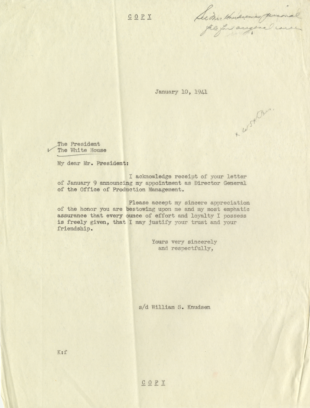 Copy of letter from William S. Knudsen to President Franklin D. Roosevelt acknowledging receipt of Roosevelt's letter announcing his appointment as Director General of the Office of Production Management.