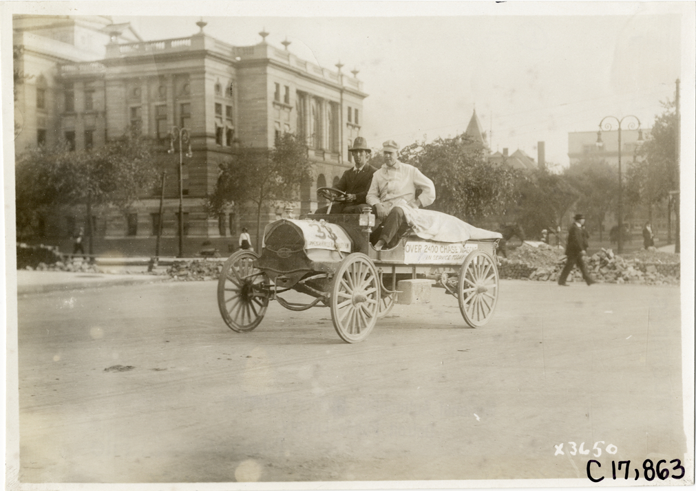 View of driver and passenger in Chase truck at Toledo, Ohio during the 1911 reliability contest sponsored by the Chicago Motor Club. Contestants traveled on routes through Illinois, Indiana, Kentucky, Ohio and Michigan. Stamped on back: "Spooner & Wells, Inc., photographers, 1231 Woodward Ave., Detroit, Mich., telephone North 1745." Handwritten on back: "Tours--Chicago Reliability Run, 1911."