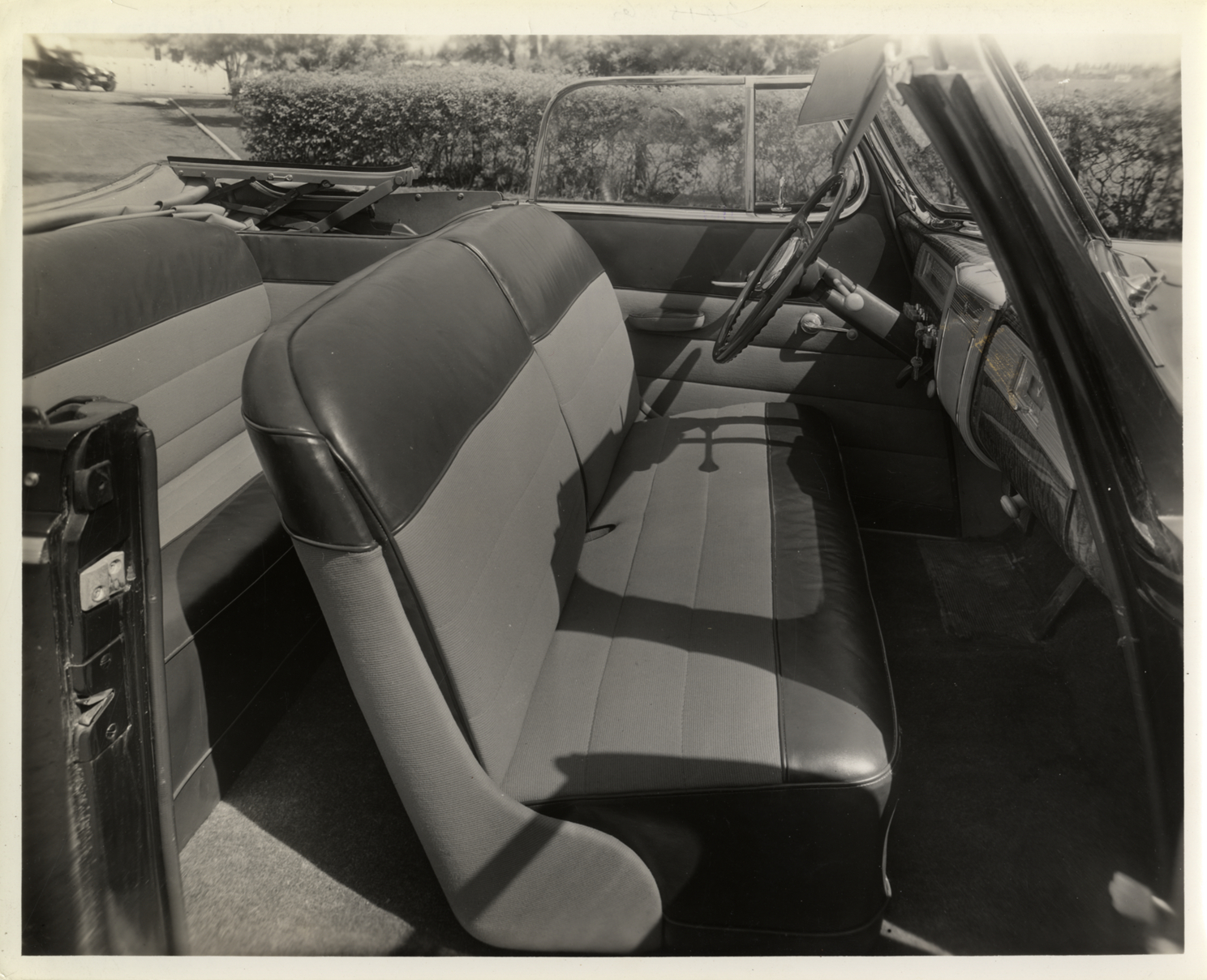 View of interior and front seat of 1941 Packard 110 car. Stamped on back: "Jun 17, 1940." Typed on back: "19th Series, 110 conv. coupe." Handwritten on back: "1941 Packard One Ten, Nineteenth Series, Model 1900, 6 cy., 100 b.h.p., 122" whb., convertible coupe, 5-p. (body-type #1489), prototype."