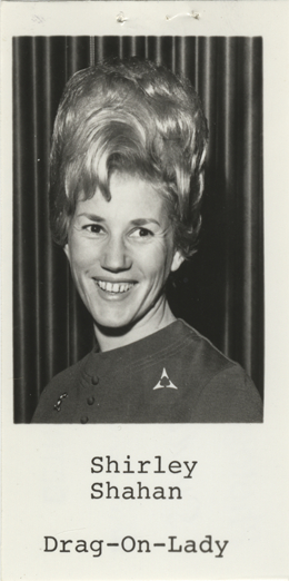 Portrait of drag racer Shirley Shahan. Printed on front: "Shirley Shahan, Drag-On-Lady."