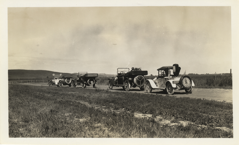 View of four cars parked on the Lincoln Highway in western Nebraska during the official trip from New York to San Francisco. Typed on back: "The Lincoln Highway, an unpaved, unsurfaced road, in western Nebraska in 1915. Official trip, New York to San Francisco."