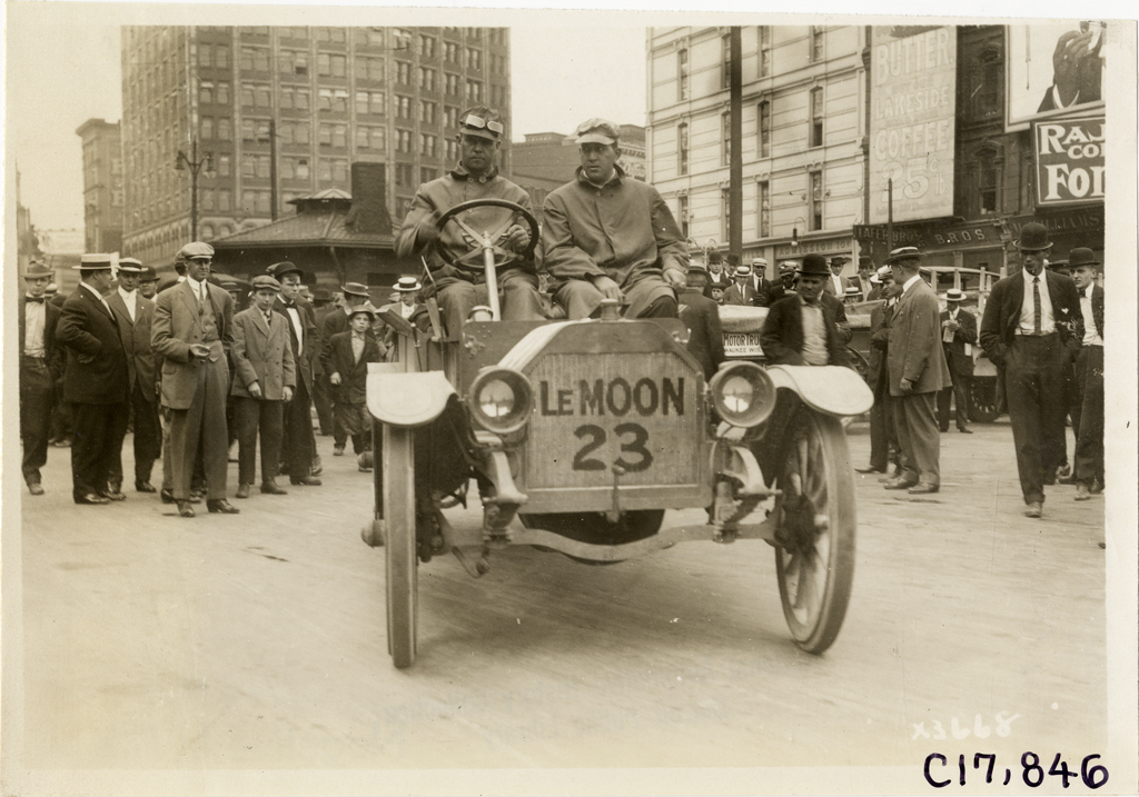 View of driver and passenger in Le Moon truck during 1911 reliability contest sponsored by the Chicago Motor Club. Contestants traveled on routes through Illinois, Indiana, Kentucky, Ohio and Michigan. Onlookers and commercial buildings in background. Stamped on back: "Spooner & Wells, Inc., photographers, 1231 Woodward Ave., Detroit, Mich., telephone North 1745." Handwritten on back: "Tours--Chicago Reliability Run, 1911."