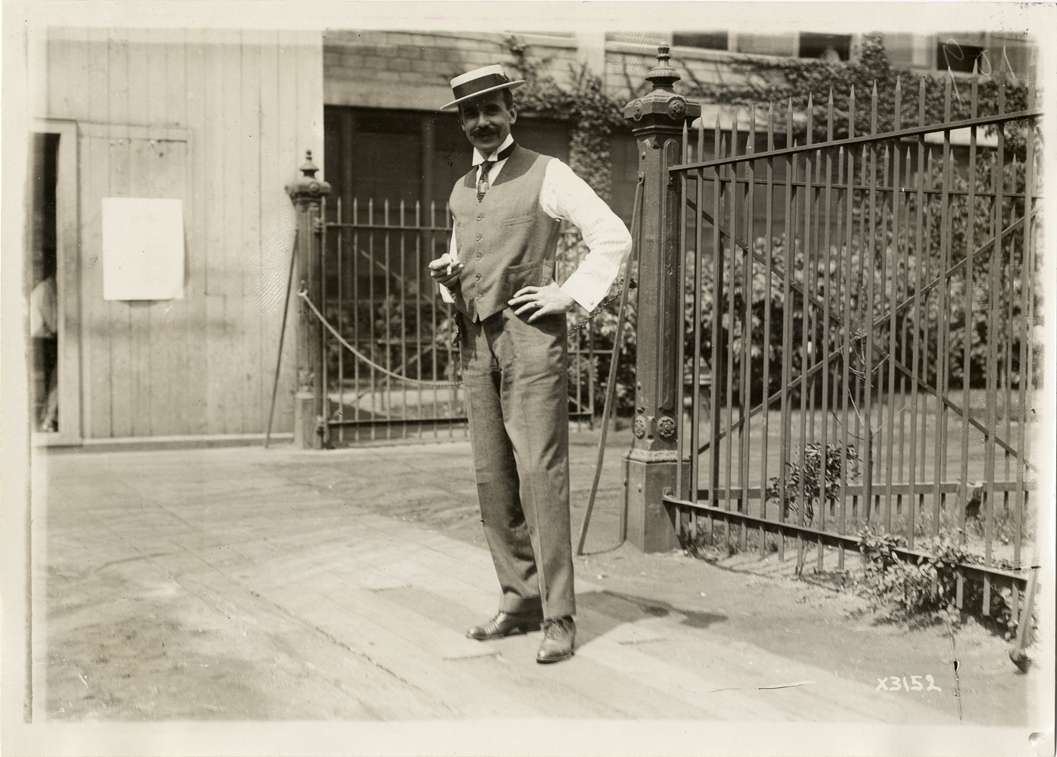 View of G.B. Demarest, from New York, New York, during the 1911 Chalmers factory tour for representatives of the Carl H. Page & Company held in Detroit, Michigan. Handwritten on back: "G.B. Demarest, New York. Tours--Chalmers salesmen factory tour, 1911."