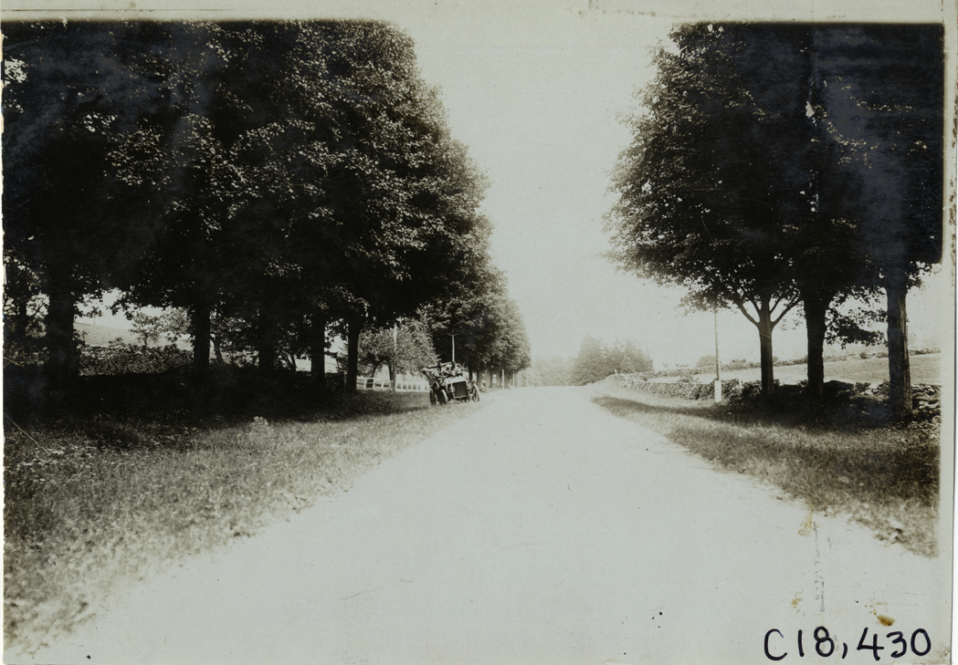 Distant view of car on side of tree-lined rural road during the 1905 Glidden Tour. Stamped on back: "Photo by F. Ed. Spooner, 1536 B'way, telephone 6536-38th St., New York, N.Y." Handwritten on back: "Tours--Glidden Tour, 1905."