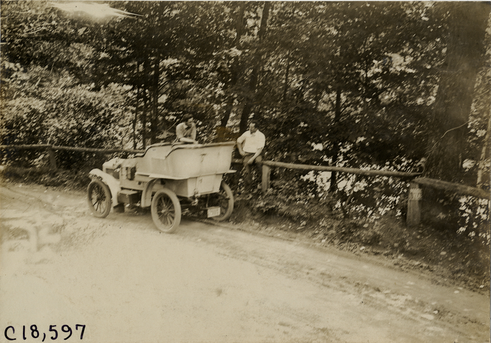 View of motorists with car parked on side of rural road during the 1905 Glidden Tour. Stamped on back: "N. Lazarnick, 29 West 42nd Street, New York." Handwritten on back: "Tours--Glidden Tour, 1905."