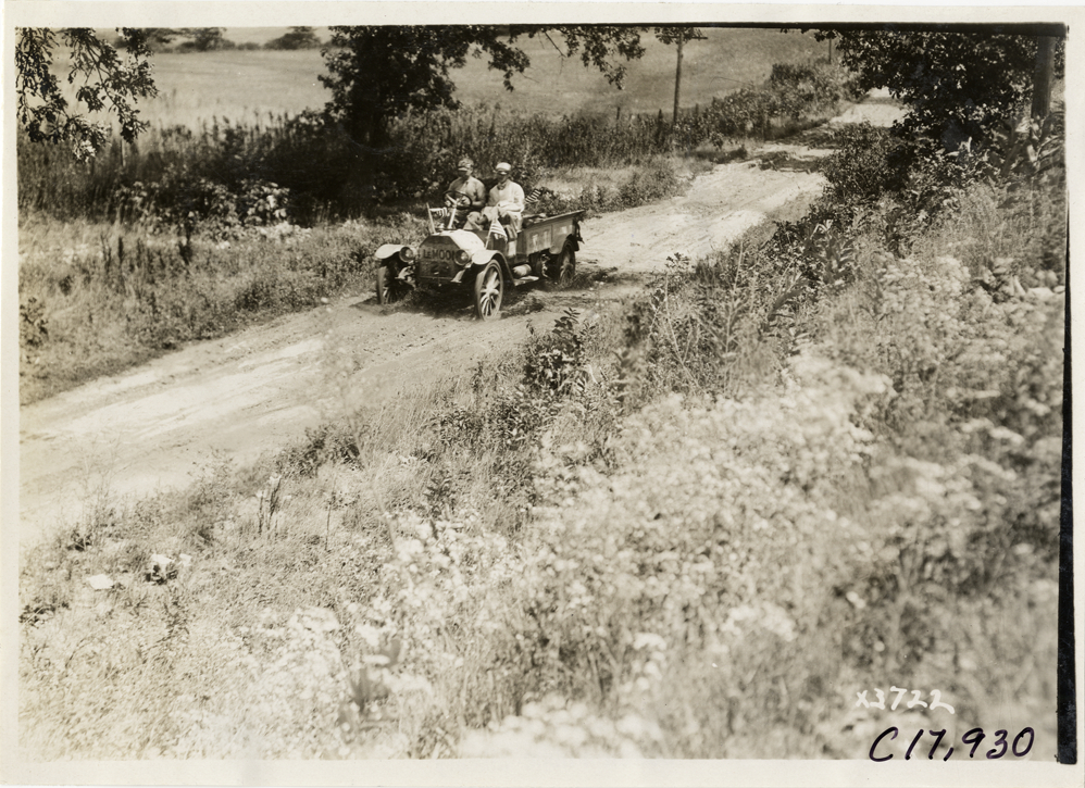 View of driver and passenger in Le Moon truck approaching standing water on rural road during the 1911 reliability contest sponsored by the Chicago Motor Club. Contestants traveled on routes through Illinois, Indiana, Kentucky, Ohio and Michigan. Stamped on back: "Spooner & Wells, Inc., photographers, 1231 Woodward Ave., Detroit, Mich., telephone North 1745." Handwritten on back: "Tours--Chicago Reliability Run, 1911."