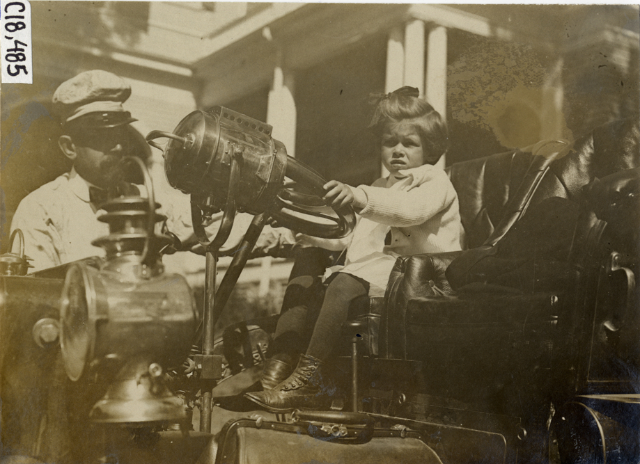 View of girl posing behind wheel in driver's seat of car during the 1905 Glidden Tour. Handwritten on back: "Tours--Glidden Tour, 1905."
