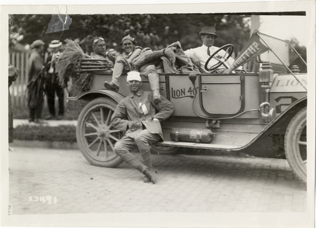 View of driver and passengers posing with Lion "40" car during the 1911 three-day reliability contest sponsored by the Cleveland News. Contestants followed routes through Ohio and West Virginia. Stamped on back: "Spooner & Wells, Inc., photographers, 1231 Woodward Ave., Detroit, Mich., telephone North 1745." Handwritten on back: "Tours--Cleveland Reliability Run, 1911."