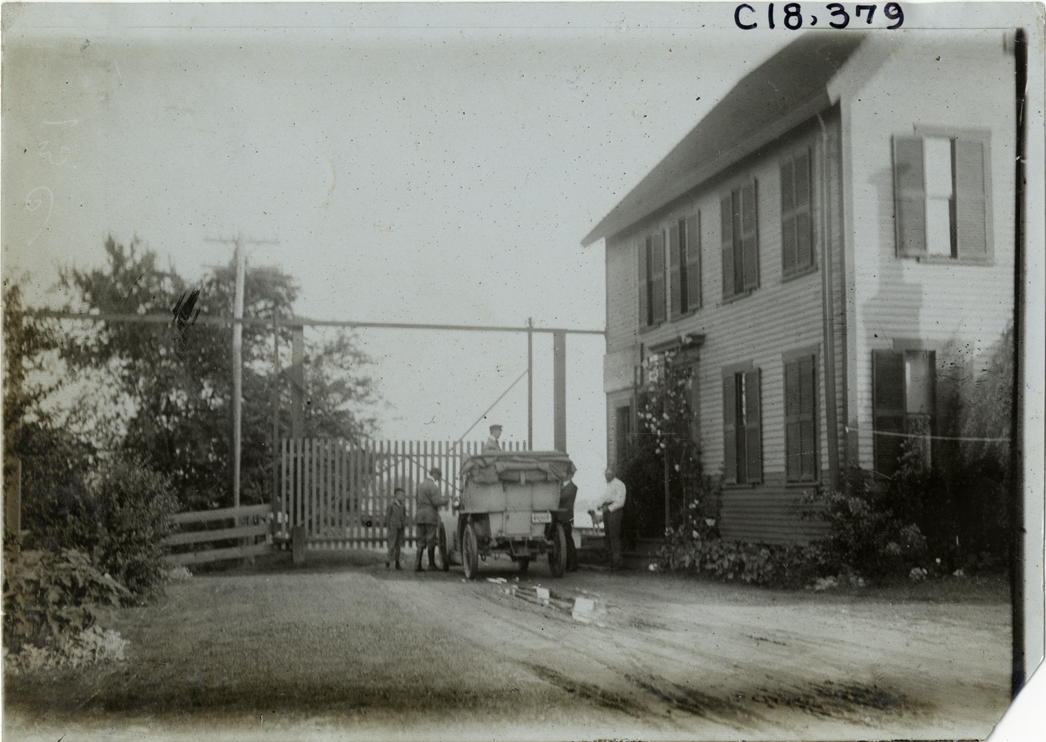 View of motorists with car parked next to wooden-frame house during the 1905 Glidden Tour. Stamped on back: "Photo by F. Ed. Spooner, 1536 B'way, telephone 6536-38th St., New York, N.Y." Handwritten on back: "Tours--Glidden Tour, 1905."