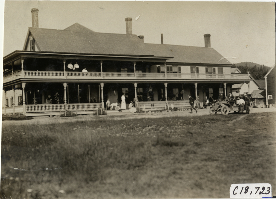View of inn or hotel during the 1906 Glidden Tour. Handwritten on back: "Tours--Glidden Tour, 1906."