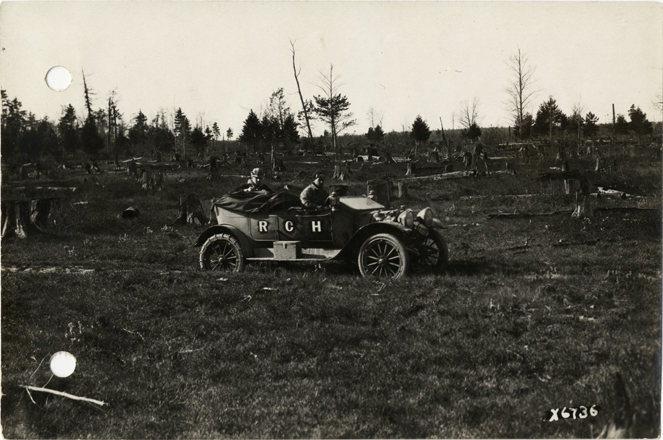 View of James Taylor and passenger in R.C.H. car driving past tree stumps in field near Manistique, Michigan during the 1912 reliability contest sponsored by the Chicago Motor Club. Contestants circled Lake Michigan, passing through Illinois, Wisconsin, Michigan and Indiana. Stamped on back: "Spooner & Wells, Inc., photographers, 1231 Woodward Ave., Detroit, Mich., telephone North 1745." Handwritten on back: "Jas. Taylor in R.C.H. in stumpland near Manistique, Chicago Reliability Run, 1912. Tours--Chicago Reliability Run, 1912."