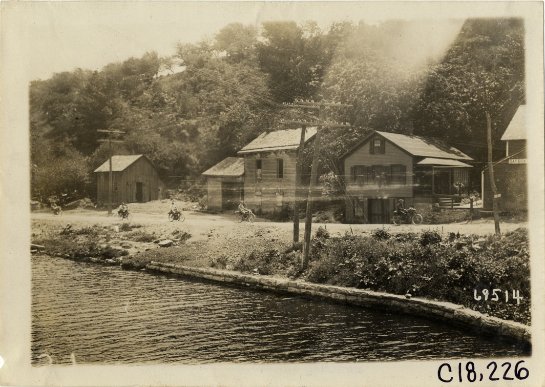 Houses along edge of canal, 1911 Federation of American Motorcyclists Tour