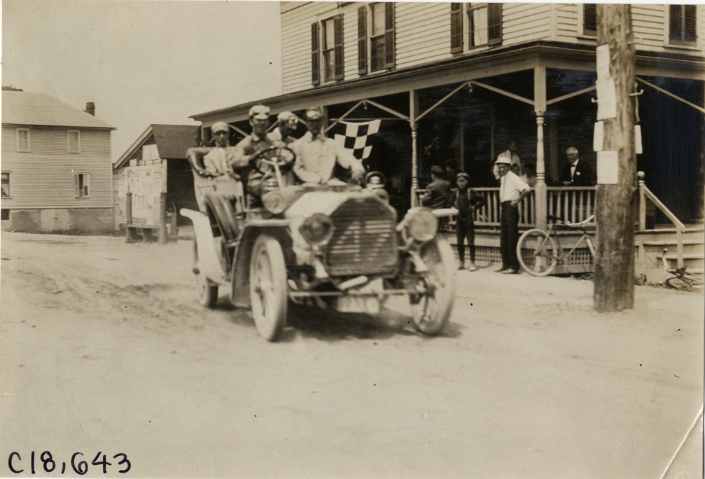 View of John L. Snow and passengers in Peerless car no. 47 during the 1906 Glidden Tour. Handwritten on back: "#47, 30 h.p. Peerless, John L. Snow. Tours--Glidden Tour, 1906."