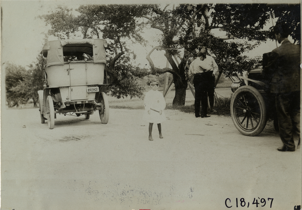View of girl wearing driving goggles during the 1905 Glidden Tour. Two cars and parked on rural road. Stamped on back: "Photo by F. Ed. Spooner, 1536 B'way, telephone 6536-38th St., New York, N.Y." Handwritten on back: "Tours--Glidden Tour, 1905."