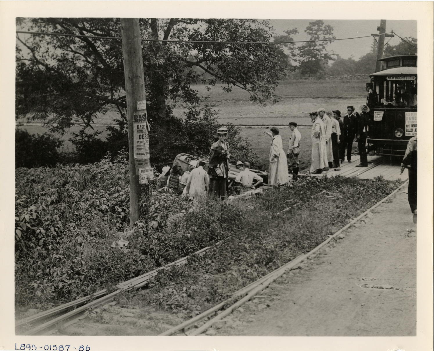View of men and women on roadside, surveying an automobile accident, during the 1905 Glidden Tour. Handwritten on back: "Tours--Glidden Tour, 1905."