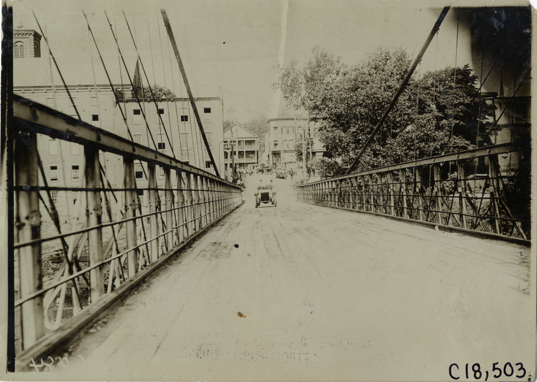 View of car crossing bridge during the 1905 Glidden Tour. Stamped on back: "Photo by F. Ed. Spooner, 1536 B'way, telephone 6536-38th St., New York, N.Y." Handwritten on back: "Tours--Glidden Tour, 1905."