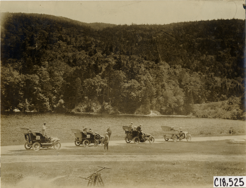 View of motorists with four cars in road during the 1905 Glidden Tour. Stamped on back: "N. Lazarnick, 29 West 42nd Street, New York." Handwritten on back: "Tours--Glidden Tour, 1905."