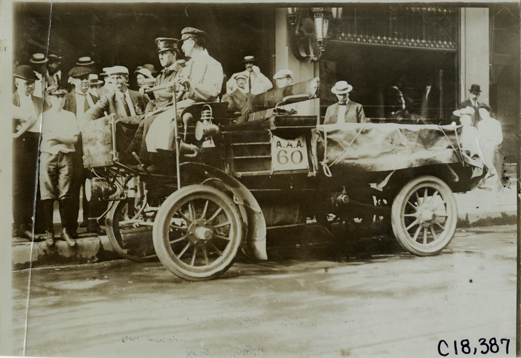 View of driver and passenger in Knox truck during the 1905 Glidden Tour. Spectators on sidewalk. Stamped on back: "Photo by F. Ed. Spooner, 1536 B'way, telephone 6536-38th St., New York, N.Y." Handwritten on back: "#60 Knox baggage wagon. Tours--Glidden Tour, 1905."