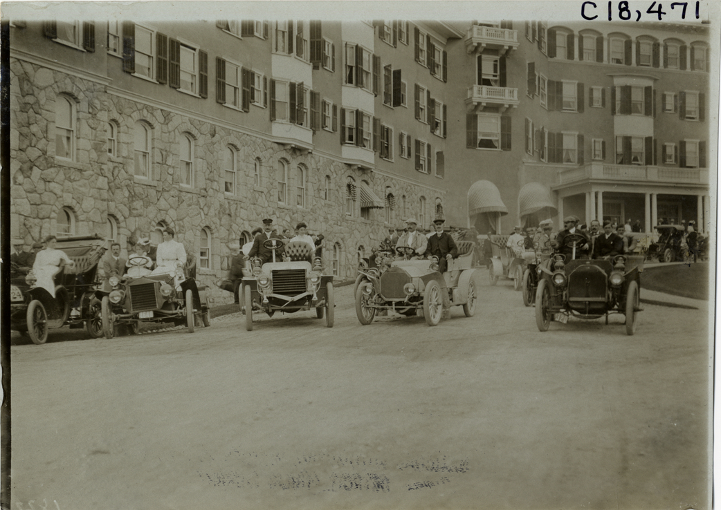 View of motorists in cars parked next to Mount Washington Hotel in Bretton Woods, New Hampshire during the 1905 Glidden Tour. Stamped on back: "Photo by F. Ed. Spooner, 1536 B'way, telephone 6536-38th St., New York, N.Y." Handwritten on back: "Tours--Glidden Tour, 1905."