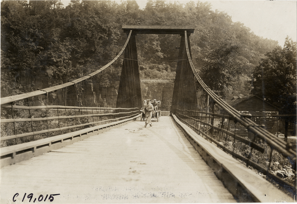 View of car crossing bridge during the 1906 Glidden Tour. Motorist walks in front of car; sign in background reads: "Twenty-five dollars fine for crossing this bridge faster than a walk." Handwritten on back: "Tours--Glidden Tour, 1906."