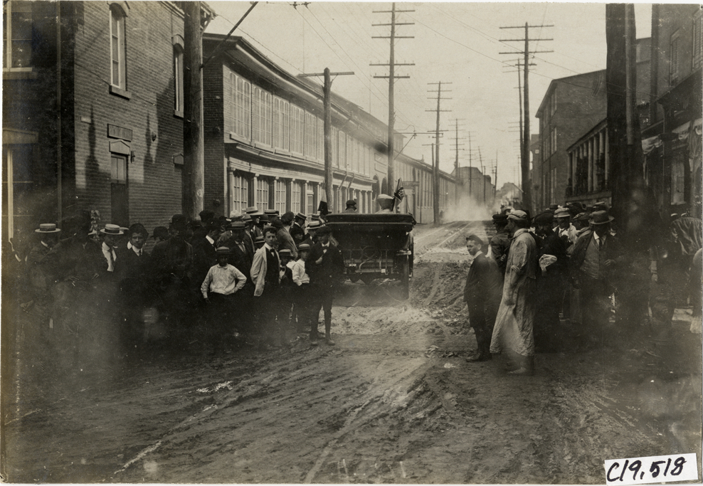 View of spectators on narrow dirt street during the 1906 Glidden Tour. Street is lined with buildings; car in background. Stamped on back: "Photo by N. Lazarnick, 29 West 42nd Street, New York." Handwritten on back: "Tours--Glidden Tour, 1906."