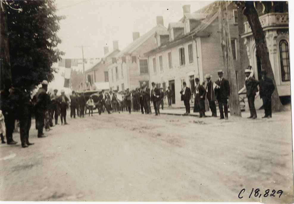 View of spectators in street behind car during the 1906 Glidden Tour. Flags are suspended over street; buildings in background. Stamped on back: "F. Ed. Spooner, and Chas. S. Wells. Motor News, Motor Photos, Motor Adv, 1536 B'way, New York. Tel 6536-38th St." Handwritten on back: "Tours--Glidden Tour, 1906."