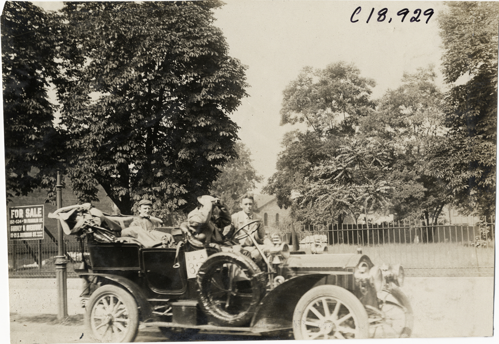 View of Ben W. Richert and passengers in Packard car no. 32 during the 1906 Glidden Tour. Handwritten on back: "#32, 24 h.p. Packard, Ben W. Richart [sic]. Tours--Glidden Tour, 1906."
