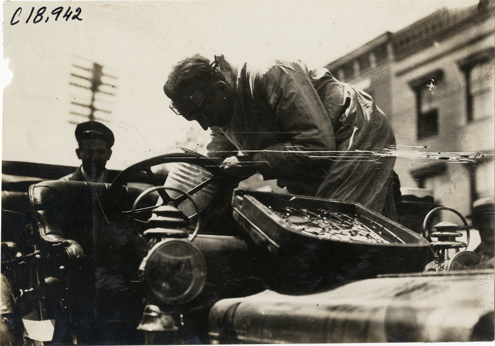 Close-up view of driver standing in front seat of car, reaching into a cylindrical metal container, during the 1906 Glidden Tour. Handwritten on back: "Tours--Glidden Tour, 1906."