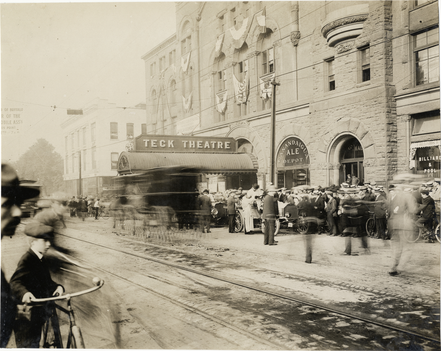 View of crowd in front of the Teck Theatre at Buffalo, New York during the 1906 Glidden Tour. Handwritten on back: "Start at Buffalo. Tours--Glidden Tour, 1906."