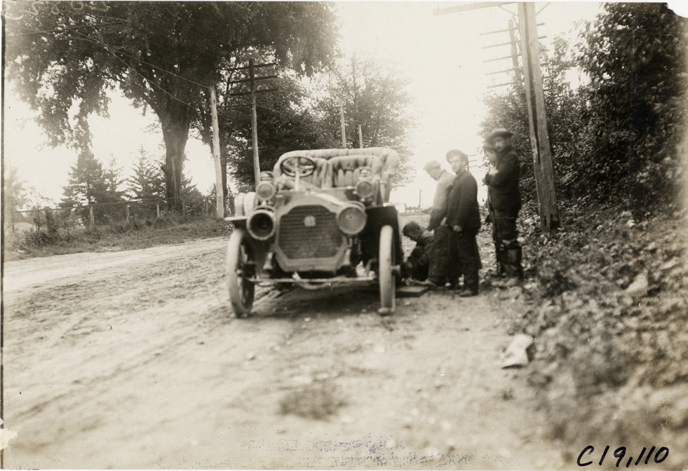 View of men on roadside changing tire on car during the 1906 Glidden Tour. Handwritten on back: "Tours--Glidden Tour, 1906."
