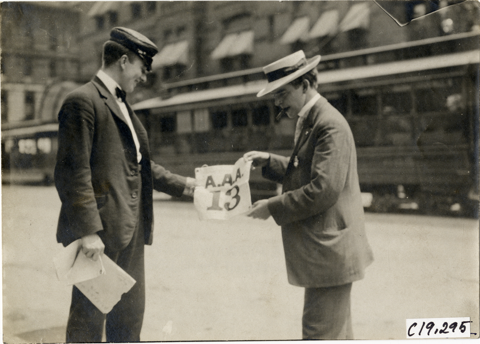Walter White and unidentified man holding "A.A.A. 13" sign, 1906 Glidden Tour