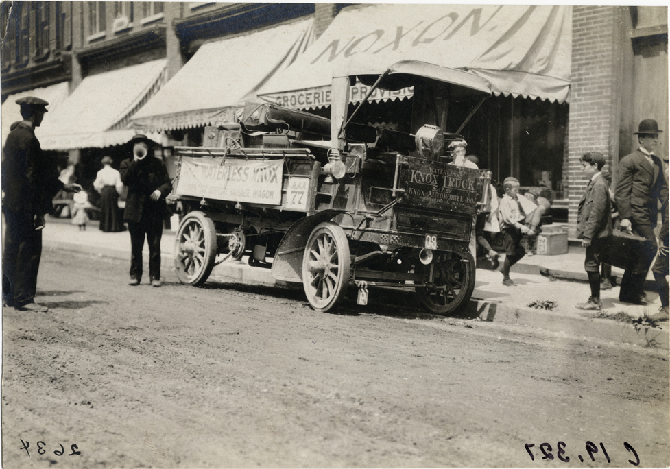 View of Knox truck parked next to curb at Utica, New York during the 1906 Glidden Tour. Signs on truck read: "The waterless Knox, Glidden Tour official baggage wagon, A.A.A. 77." Storefronts in background. Stamped on back: "Photo by N. Lazarnick, 29 West 42nd Street, New York." Handwritten on back: "Knox truck at Utica. Tours--Glidden Tour, 1906." Image is reversed.