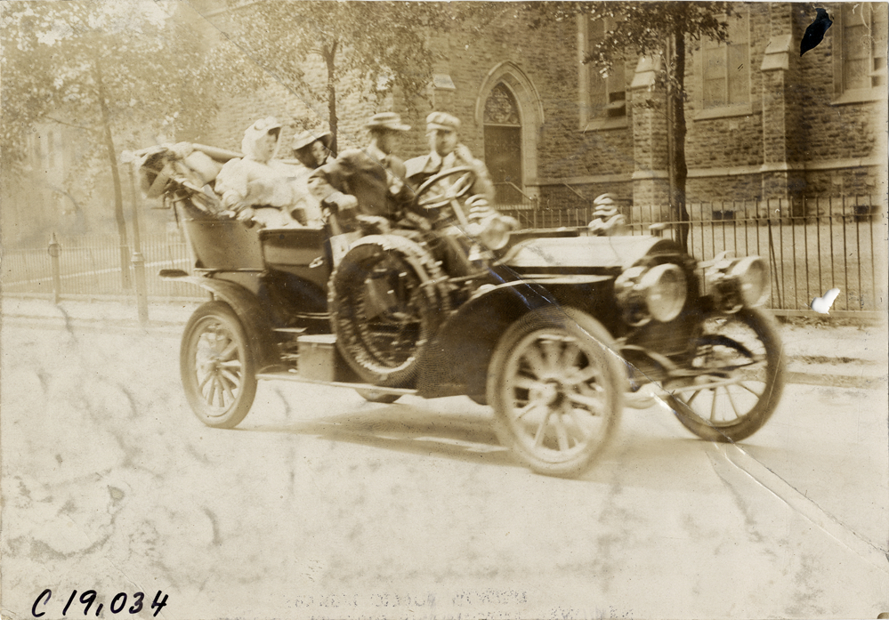 View of driver and passengers in car during the 1906 Glidden Tour. Church in background. Handwritten on back: "Tours--Glidden Tour, 1906."