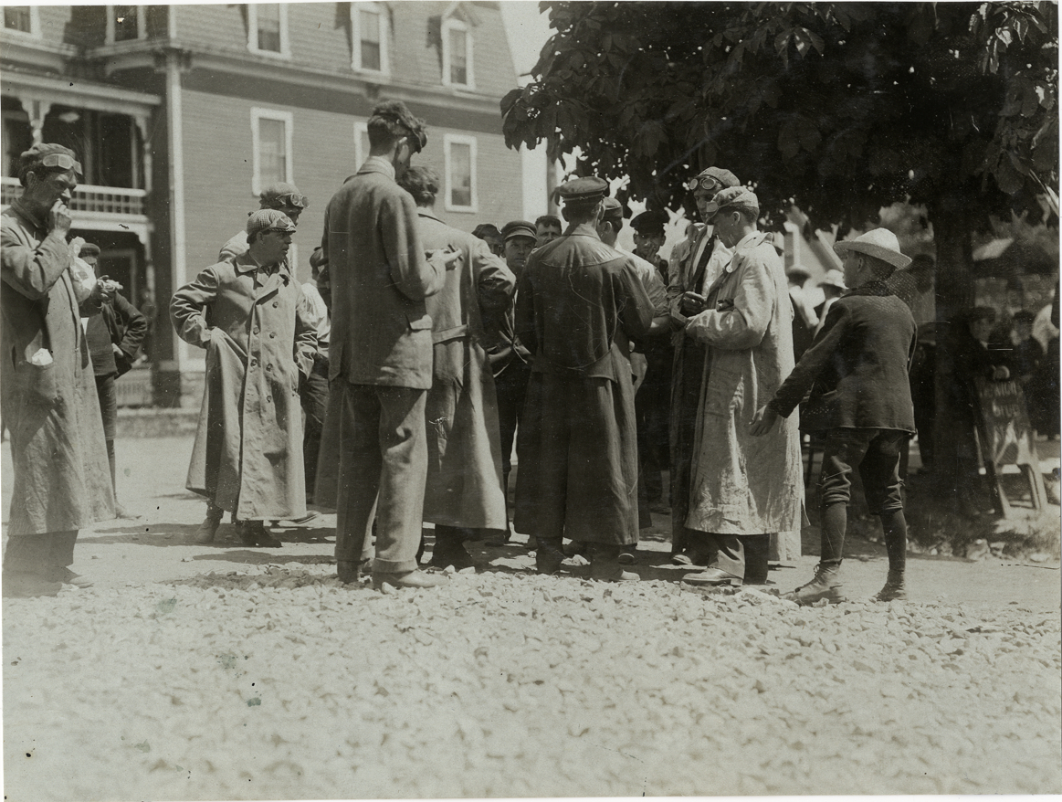 View of crowd at checking station during the 1906 Glidden Tour. Tree and wooden-frame building in background. Stamped on back: "F. Ed. Spooner, and Chas. S. Wells. Motor News, Motor Photos, Motor Adv, 1536 B'way, New York. Tel 6536-38th St." Handwritten on back: "Tours--Glidden Tour, 1906."