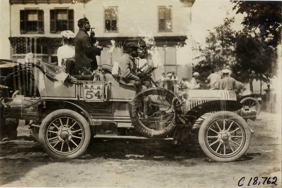 View of W.L. Davis and passengers in Pope-Hartford car no. 54 during the 1906 Glidden Tour. Stamped on back: "F. Ed. Spooner, and Chas. S. Wells. Motor News, Motor Photos, Motor Adv, 1536 B'way, New York. Tel 6536-38th St." Handwritten on back: "#54, 20-25 h.p. Pope-Hartford, W.L. Davis. Tours--Glidden Tour, 1906."